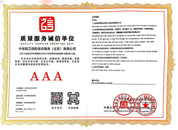 中保國衛(wèi)國際保安服務(wù)(北京)有限公司,屬中保國衛(wèi)集團旗下子公司。能全方位的為大型客戶提供優(yōu)質(zhì)的安保、押運服務(wù),是集人防和技防于一體的新型正規(guī)化綜合安保押運服務(wù)企業(yè),提供人防、物防、技防、聯(lián)網(wǎng)報*、非武裝押運等安防相關(guān)的一站式服務(wù)。